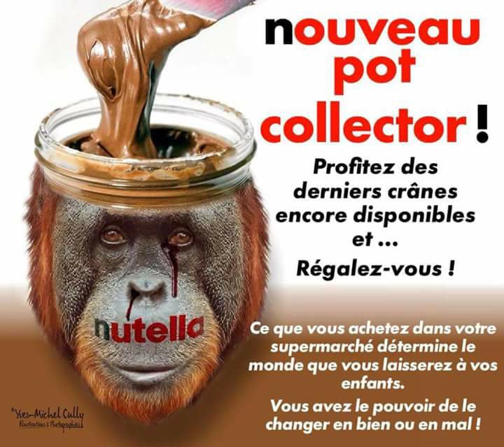 Petite précision nécessaire, 3/4 de l'huile de palme utilisée en France l'est dans notre carburant. Donc c'est bien gentil encore une fois d'essayer de culpabiliser le consommateur, mais pour le coup même en faisant l'effort de se priver de Nutella cela ne changera pas grande chose. Aucun d'entre nous n'a décidé qu'il fallait mettre de l'huile de palme dans le diesel, c'est à nos gouvernements qui ne savent que créer des taxes pour répondre aux problèmes écologiques d'avoir une politique cohérente. D'un côté on nous taxe pour nous punir d'être des salauds de destructeur de la planète, mais de l'autre on nous met du sang d'orang-outan dans le carburant et on diminue les aides à l'achat d'un véhicule électrique. D'un côté on nous dit qu'il faut limiter nos déplacements pour moins polluer, mais de l'autre on ne sanctionne pas les employeurs qui se décident du jour au lendemain à déménager obligeant les employés à faire des km supplémentaires chaque jour.