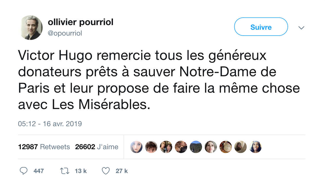 Pour tous les débiles qui critiquent le fait que les gens s'émeuvent et collectent des fonds pour Notre Dame plutôt que pour les miséreux, les français font chaque années 7.5 milliards de dons, ce qui prouve notre générosité malgré les taxes auxquelles nous sommes déjà soumis et la difficulté parfois à boucler son budget.