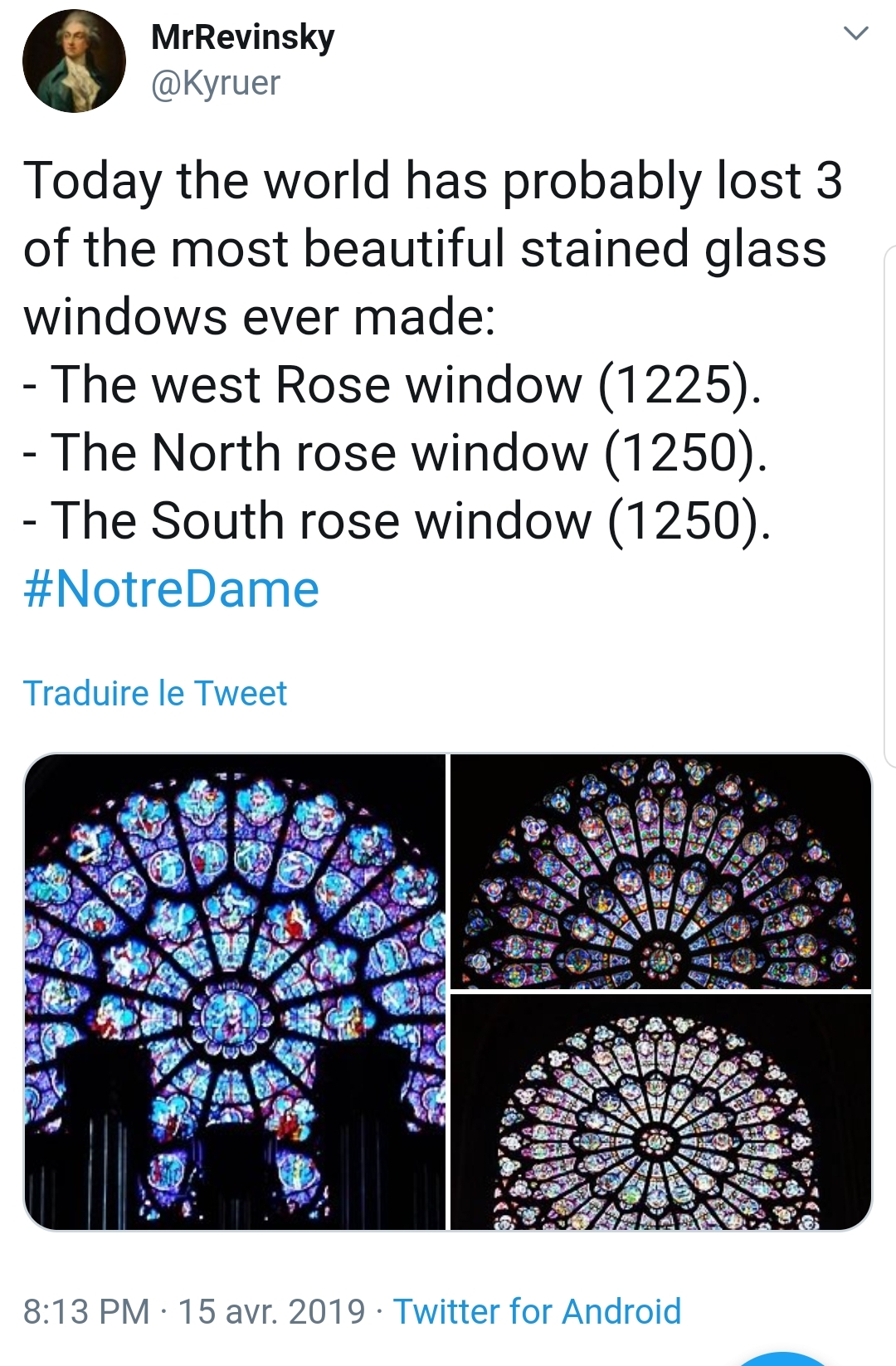 C'est un drame au niveau du patrimoine je suis d'accord, mais relis les commentaires de @Garnouille, @UnPeon ou @Alex333 (et d'autres par la suite)... tout de suite on voit du feu alors ça y est on imagine tout de suite le pire. De plus les dernières rénovations datent du XIXè, bref à part ce qui a pu brûler à l'intérieur (comme les vitraux et orgues comme on me l'a à juste titre fait remarquer), au niveau architectural rien n'est irréparable. Je dis pas qu'il ne faut pas être triste mais faut arrêter avec la surdramatisation de tout.