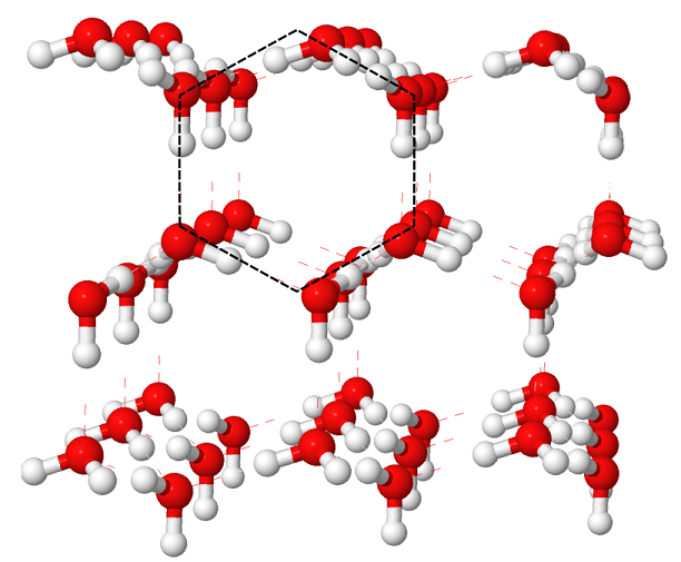 Point intéressant : même dans cette forme de glace compacte, on retrouve l'origine de la forme hexagonale du flocon de neige avec ses 6 branches (cf. les pointillés que j'ai tracé).