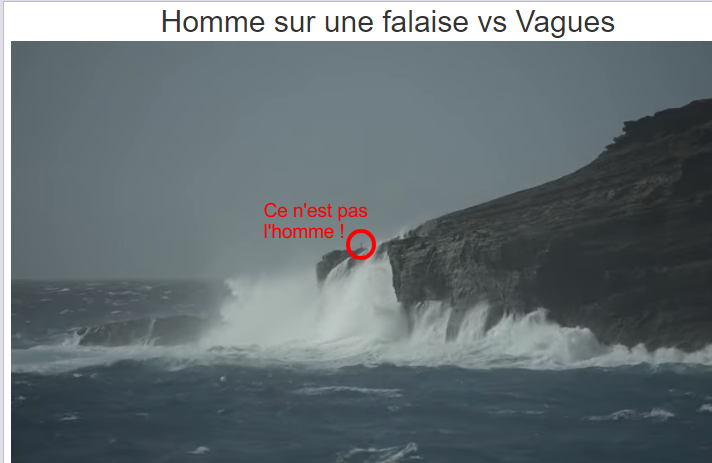 Le rocher sur lequel il se rend ne reçois que très peu d'eau, alors certes il est penché et proche du vide mais l'eau refoulée passe autour et même sur la 'petite' vague entre 1:15 et 1:19 il bouge pas d'un poil et la 'grosse' vague de 1:24 l'arrose pas vraiment. Perso j'aime bien les sensations extrêmes mais là je lui laisse, en tout cas j'aimerais bien voir ça vidéo