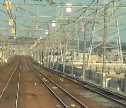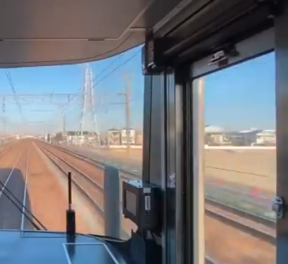 C'est très logique. Les trucs loin (donc petits) se rapprochent visuellement plus lentement que les poteaux sur le côté qui défilent à la vitesse du train, parce que la distance qu'ils parcourent nous paraît plus petite aussi. Cela dit la vidéo est bien faite.
