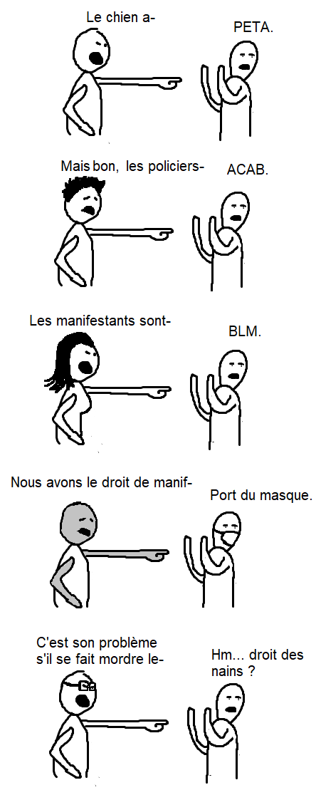 Mais non, tu tournes le dos au chien pour ensuite demander ce qu'il va pas au flic qui est "forcément en tort" quand le chien bouffe le cul d'une personne. Alors que tu vois clairement le flic arrêter le chien...