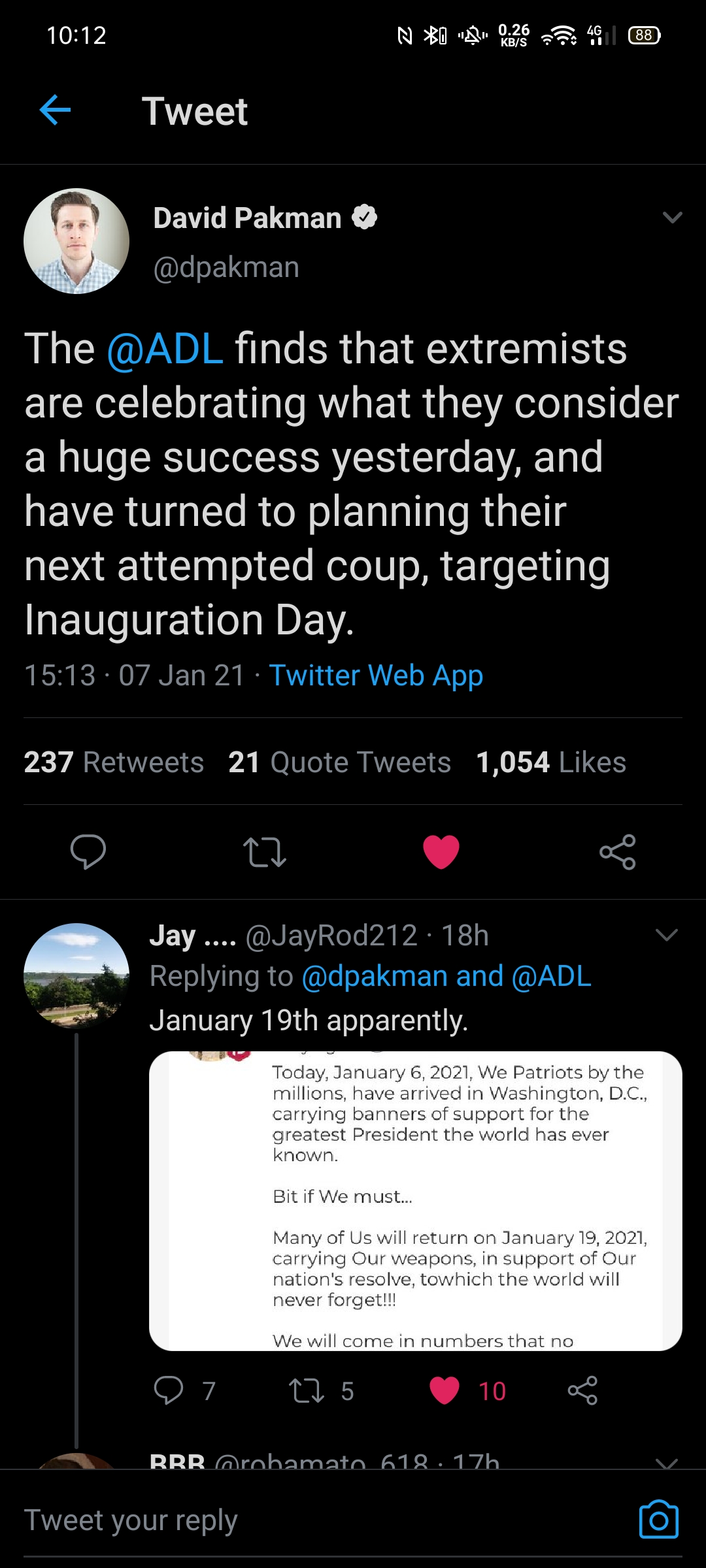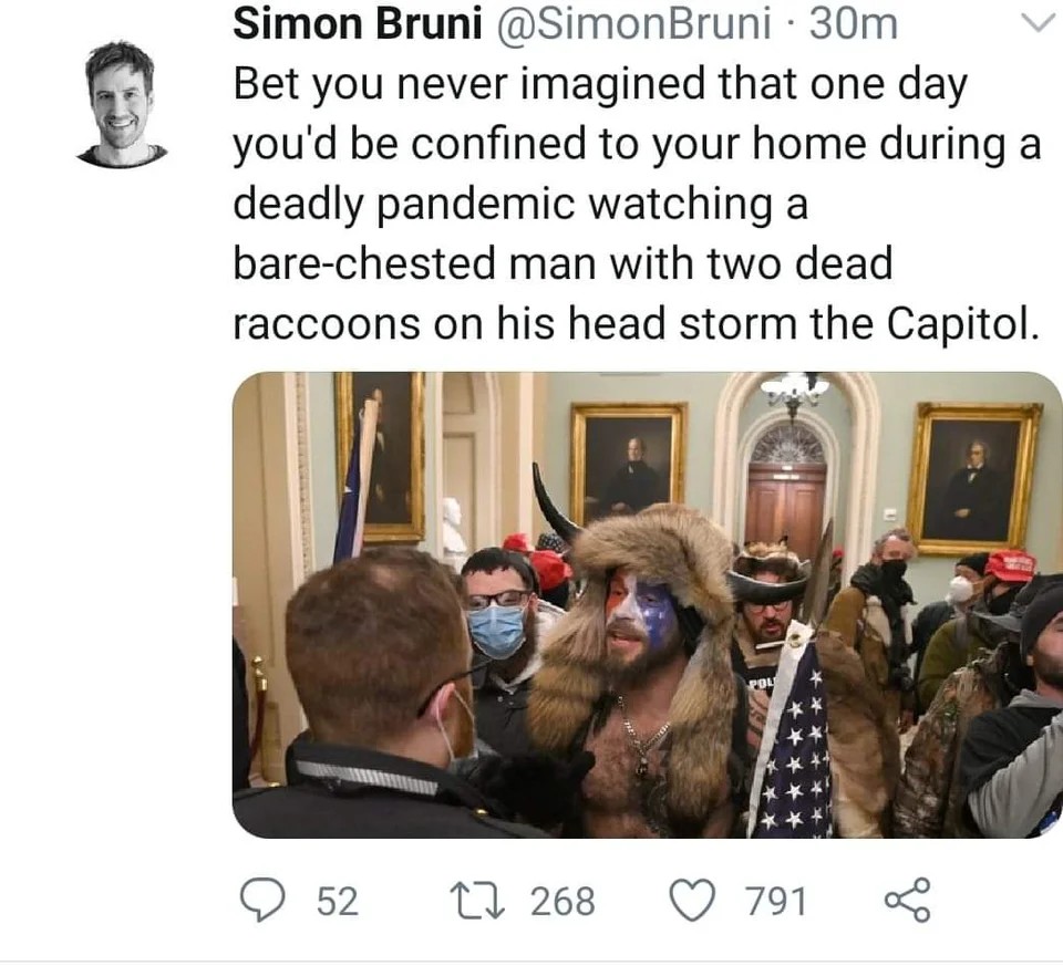 Et pour finir, N'association pas des idées néfaste à ce que la connerie peut expliquer. Pour la protection du capitole différentre en BLM et là, je pense que sincèrement, les mecs qui organisent la défense, ne se sont pas dit que, le jour de la confirmation au sénat de Biden, Trump qui organisait une conférence devant le capitole allait pousser ses partisan à prendre d'assault le Capitole, là tout de suite .... Alors ont pourra dire ce qu'on veut "il l'a pas dis clairement etc..." il à clairement sous entendu et bien mis en tête, que "March on the capitol" est la seul manière de protéger la démocratie ... Et je pense sincèrement (peut être mon côté positif) que les FdO n'avait pas anticiper une telle connerie de Trump ... Pensant que Trump allait se contenter de provoquer en disant "j'ai gagné, gniagniagnai".