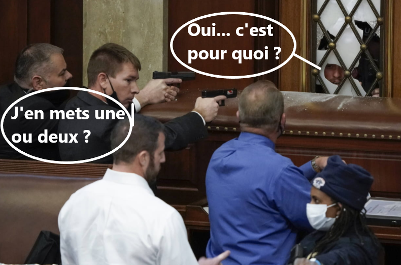 Essayez d'imaginer ce qu'aurait donné un assaut donné par le SWAT… Les couloirs du Capitole remplis de fumées, de cris, de détonations… Nan, ils ont clairement merdé en laissant rentrer trop facilement cette foule, mais ils sont bien géré la sortie. Juste dommage pour cette femme, sa mort aurait du être évitée ! …