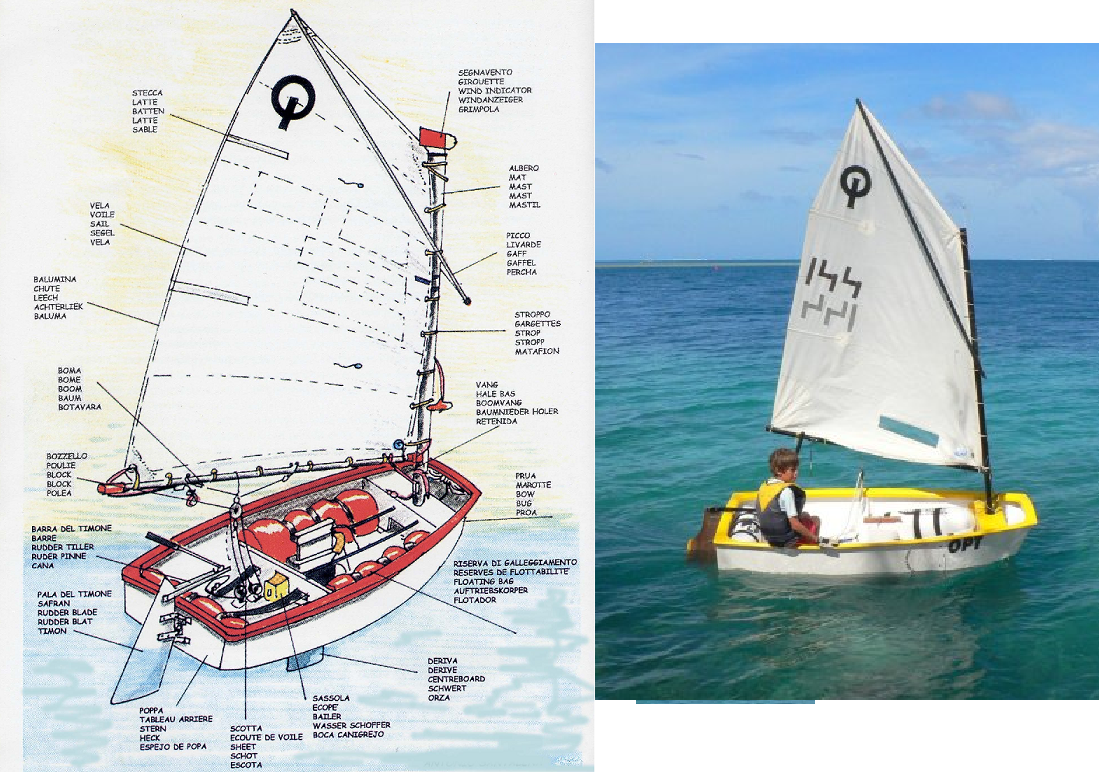 C'est le nom du machin. Un petit bateau à voile à l'avant carré et avec (généralement) une voile de forme trapézoïdale, ce qui le rend très reconnaissable, pour enfant jusqu'à 16 ans. Il y a plusieurs modèles mais ils ont tous la même forme générale. Il existe depuis 1947.