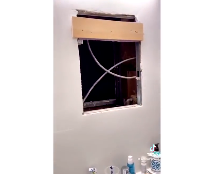 L’explication la plus simple (mais évidemment tout est possible), c’est que c’est un même apartment où ils font des rénovations et l’idée lui est venu d’en faire une série de vidéos TikTok quand elle a vu que ça faisait un courant d’air autour du miroir.
