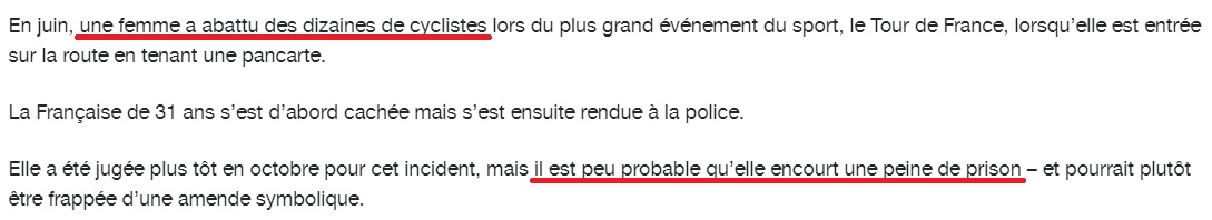@gazeleau Elle a clairement eu un souci sur l'appréciation des distances et de la vitesse. Elle avait déjà un problème sur l'appréciation de la situation. Rien que pour ce genre de personnes, il faut encadrer les manifestations sportives plus que de raison.