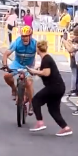 Les spectateurs sont tous tres mal eduqué dans cette video... - Le publique qui se penche vers l'avant pour regarder - Le publique qui ne respecte pas les bandes au sol et se decalle sur la piste pour regarder - L'idiot qui traverse juste avant l'arrive des cyclistes - La femme qui surement le suit et qui ne reflechi pas plus...
