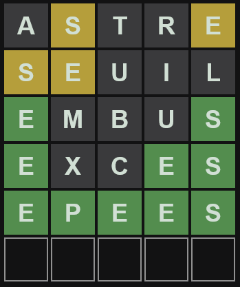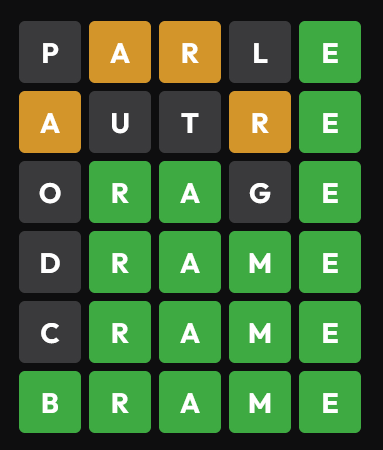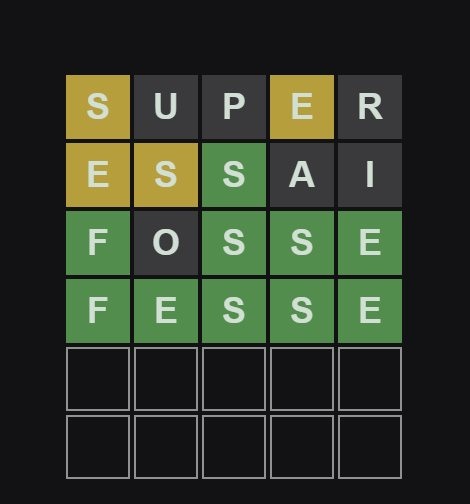 Par contre, contrairement à ce que disait un VDD, la technique de "mettre les lettres les plus utilisées en premier" (que j'utilise aussi, je commence toujours par "astre") n'est pas si incroyable que ça. En tous cas elle ne rend pas le jeu si trivial. Déjà, elle ne prend pas en compte les répétitions (aujourd'hui, par exemple il y avait deux E). Ensuite, c'est bien beau de savoir que les lettres les plus utilisées sont "AERSTLN" (grosso modo), mais ce n'est pas pour autant qu'il faut essayer d'absolument toutes les caser dans les deux premiers essais. En premier essai, ok. Mais le second essai est bien obligé de prendre en compte le premier. Car si on m'apprend qu'il y a un "N" en première position par exemple, j'ai pas besoin d'être Sherlock pour me douter qu'il y a sûrement une voyelle en deuxième position par exemple. Bref, ce n'est pas juste la fréquence de chaque lettre qu'il faut regarder, mais aussi la fréquence de chaque syllabe.