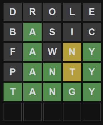 Genre ajd en anglais, "TANGY", perso au 2ème essai par hasard j'ai essayé "TANGO", et ben après j'avais plus d'idées pour la dernière lettre en vrai ...