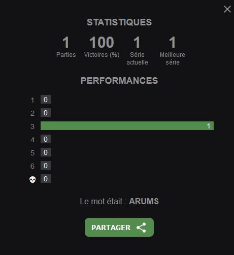 @zygopetalum En fait le jeu est sympa, il te laisse une infinité d'essais après le 6eme. Par contre tu n'as pas le mot en vert à la fin, pour signifier que tu n'as pas vraiment réussi.