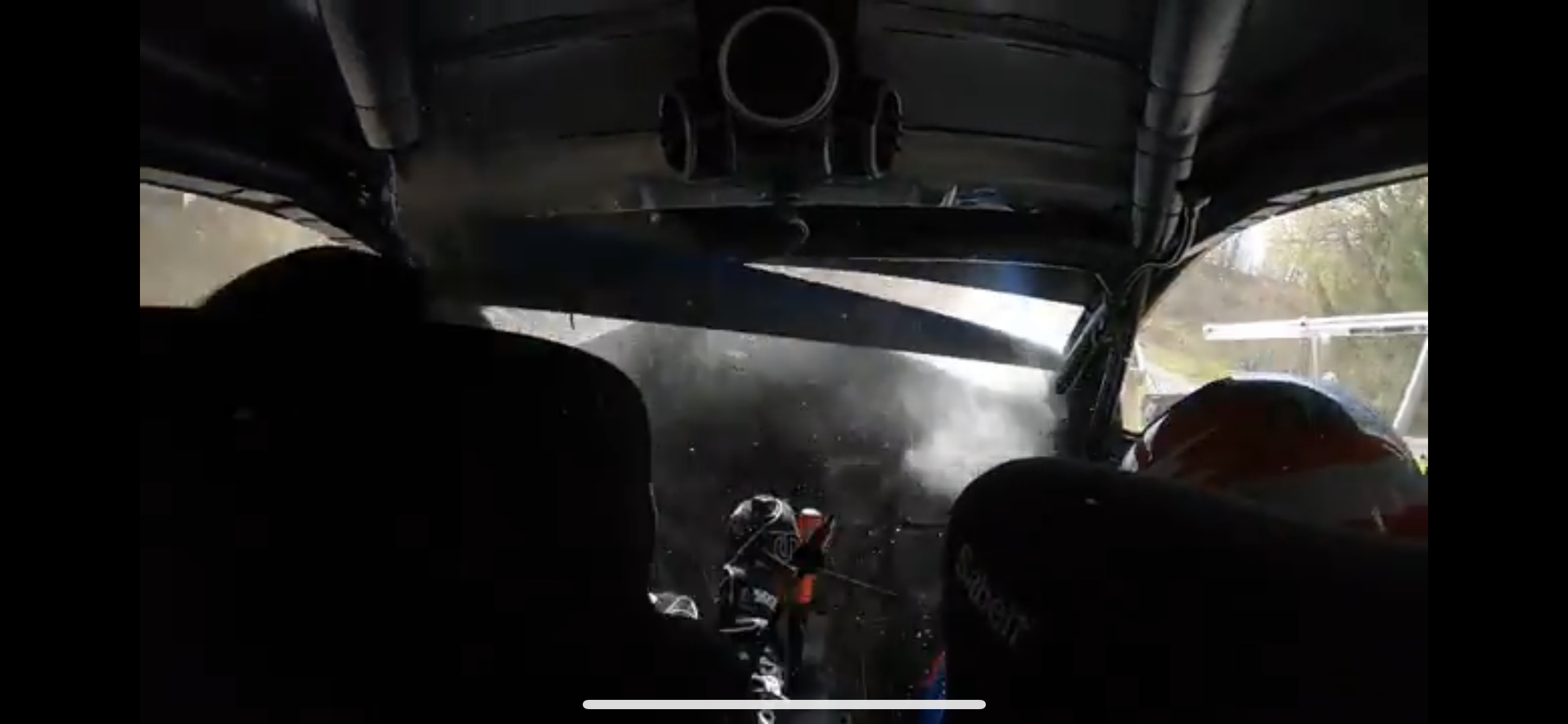 Si le montant de la voiture avait dévié la barre par la fenêtre du co-pilote, je pense que lui l'aurait vraiment eu au niveau du visage. C'est vraiment un sacré coup de chance que la barre soit passé par le part-brise, au milieu des deux, quitte a juste effleurer le haut du casque du pilote.