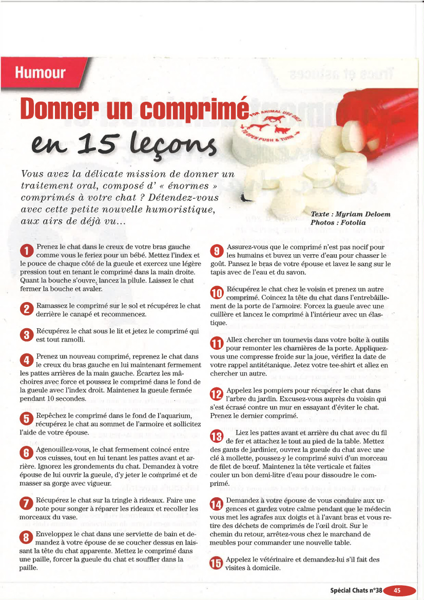 Le mien détectait toujours le médicament planqué dans la bouffe et le laissait de côté. Et puis un jour on a compris qu'il suffisait de lui lancer le comprimé en l'air et qu'il le gobait en vol...