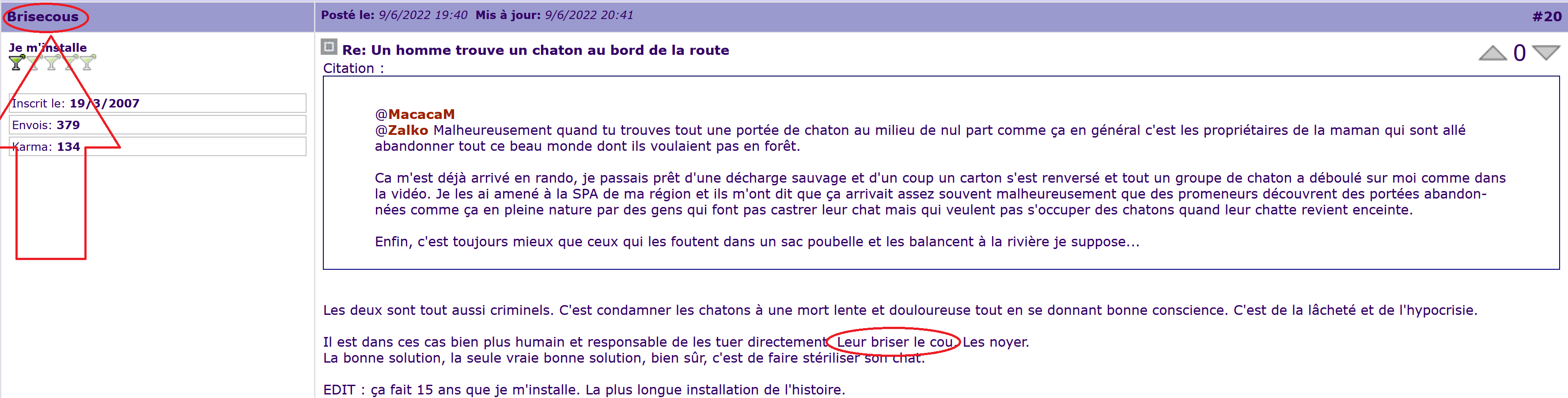 Les deux sont tout aussi criminels. C'est condamner les chatons à une mort lente et douloureuse tout en se donnant bonne conscience. C'est de la lâcheté et de l'hypocrisie. Il est dans ces cas bien plus humain et responsable de les tuer directement. Leur briser le cou. Les noyer. La bonne solution, la seule vraie bonne solution, bien sûr, c'est de faire stériliser son chat. EDIT : ça fait 15 ans que je m'installe. La plus longue installation de l'histoire.