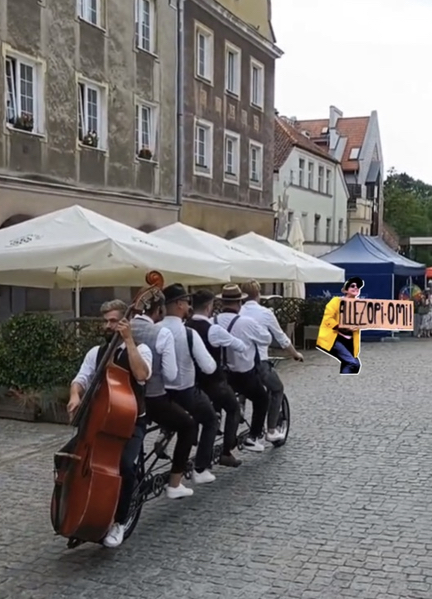 Citation : A Olsztyn en Pologne, un orchestre ambulant joue de la musique dans les rues de la ville en se déplaçant à tandem. Le vélo comporte 6 places (5 selles et un porte-bagage) et transporte 5 musiciens et un pilote. L'orchestre est composé d'accordéoniste, de violoncelliste et de violoniste. L'orchestre est composé d'un accordéoniste, d'un contrebassiste, d'un clarinettiste, d'un " planche-à-laver-iste" (washboard), et d'un violoniste.