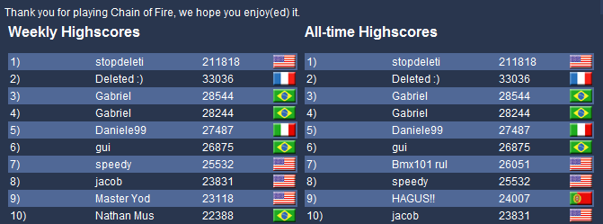 \o/ je tenais à vous montrer mon score quand même (pour une fois que j'en fais un XD) Weekly Highscores 96) Yaoh 19292 FRANCE All-time Highscores 100) Yaoh 19292 FRANCE