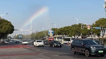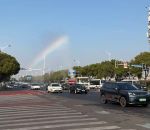Un camion circulant sur une route fabrique un arc-en-ciel en projetant de l'eau en l'air. La brumisation pourrait soit servir à capter les particules fines en suspension et les faire retomber au sol, soit à faire baisser la température locale par évaporation. On peut voir l'arc-en-ciel car les gouttelettes très fines diffractent la lumière du soleil.