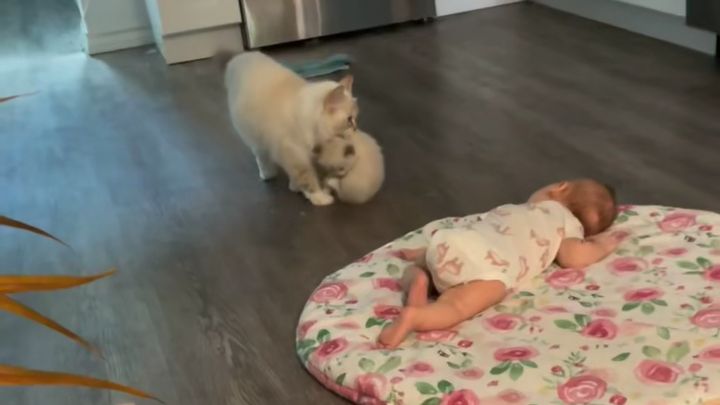 Dans la chatterie Pearl's Ragdolls à Fort Worth au Texas, la chatte Summer présente son petit au bébé humain de la famille.