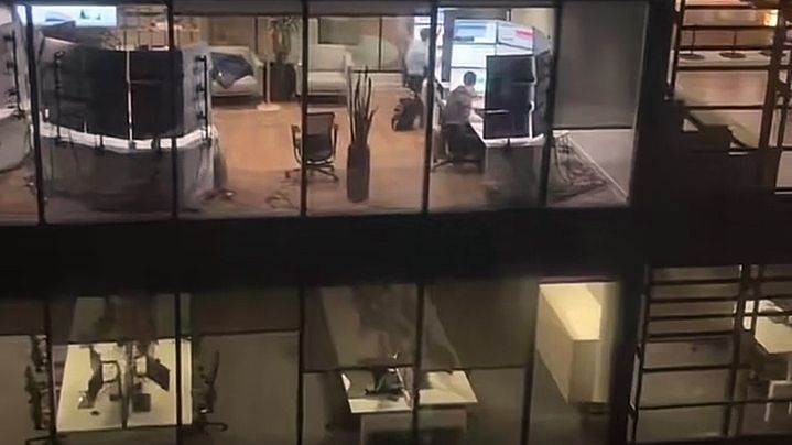 Depuis un immeuble, une personne a filmé les bureaux de la BBC News et le setup impressionnant des personnes qui y travaillent. On peut voir des employés devant 15 écrans, 5 rangés de 3 moniteurs.