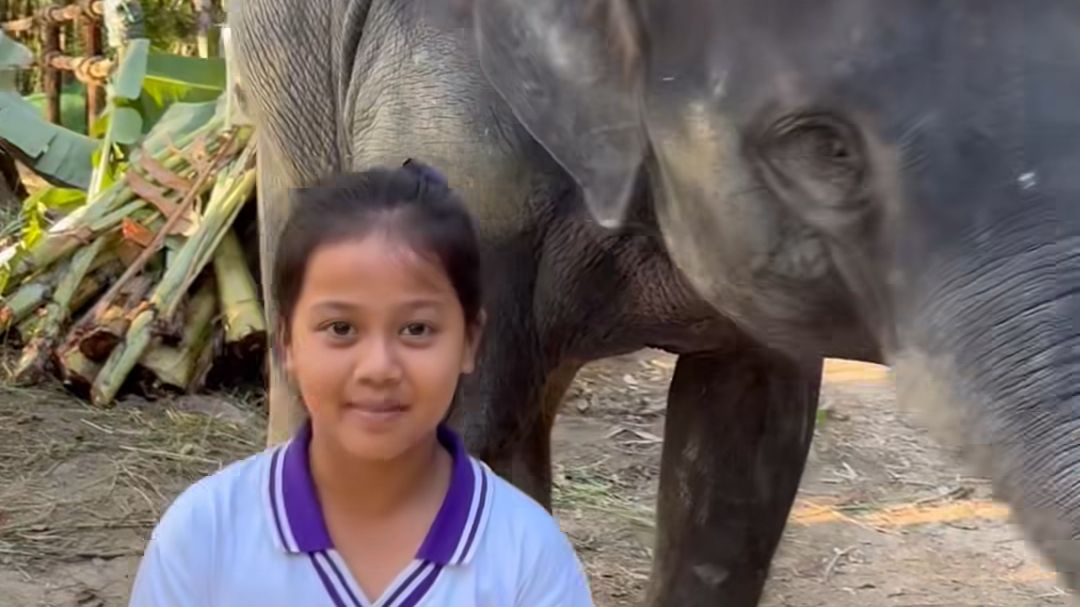 En Thaïlande, une fillette donne à manger de la pastèque jaune à Yaya l'éléphant. Et à chaque fois, elle a en récompense un petit bisou.