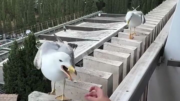 Ces goélands ne manquent pas une bonne occasion pour rire. Deux goélands sont sur le rebord d'un balcon attendant qu'un humain leur donne à manger. Un troisième larron essaie de se poser mais loupe son atterrissage. Les deux goélands se mettent à « rire »