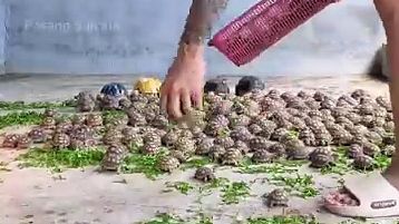 Dans une ferme de tortues Sulcata en Thaïlande, un soigneur a apporté de la salade. Des dizaines de tortues se précipitent sur la nourriture pour manger.