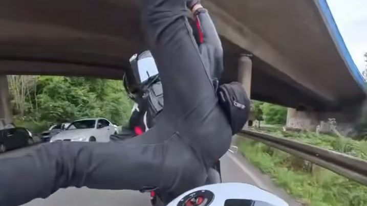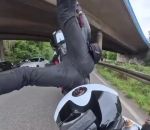 Un motard percute une moto par l'arrière et provoque plusieurs chutes. Il tombe et fait tomber le motard qu'il a percuté. La moto du motard percuté roule en mode fantôme et percute un motard garé sur le bas-côté.