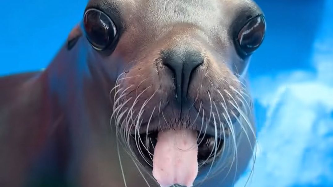 Dans un zoo, un soigneur touche la queue d'une otarie qui ne semble pas aimer le geste. L'otarie tire la langue et semble rouspéter.