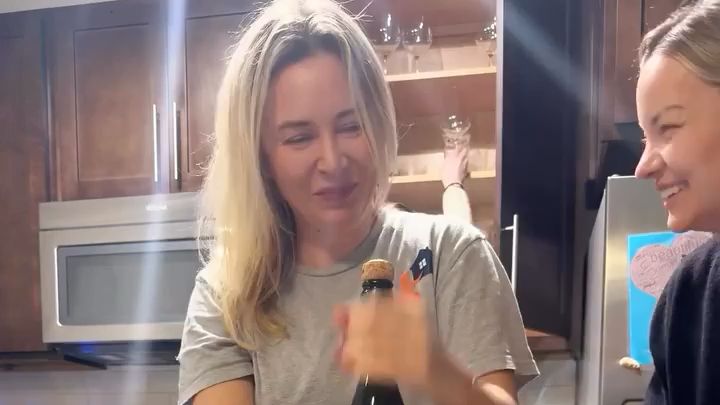 Dans une cuisine, une femme a une technique pour ouvrir une bouteille de champagne. Elle frotte vigoureusement le haut de la bouteille avec sa main, sans toucher au bouchon. Au bout de quelques secondes, le bouton saute.