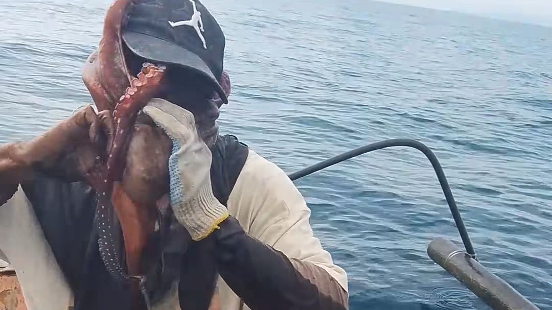Sur sa pirogue aux Philippines, un pêcheur essaie de se débarrasser d'un pieuvre un peu trop collante. Les tentacules de l'animal sont accrochés à son visage. Après quelques secondes de lutte, l'homme arrive enfin à la décrocher.